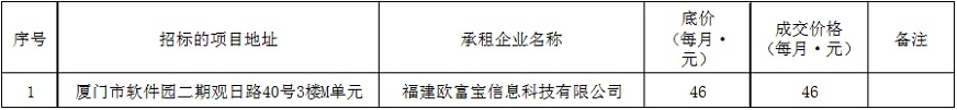 根據(jù)思明區(qū)國有企業(yè)資產(chǎn)出租管理的相關(guān)制度,我司2019年4月22日上午9:00于觀音山營運(yùn)中心2號樓2層2號會議室進(jìn)行公開招租現(xiàn)場開標(biāo),現(xiàn)通過思明控股網(wǎng)站對外發(fā)布成交公告,內(nèi)容如下: