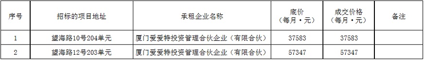 根據(jù)思明區(qū)國有企業(yè)資產(chǎn)出租管理的相關(guān)制度,我司2019年5月10日上午9:00起于觀音山營運中心2號樓2層2號會議室進(jìn)行公開招租現(xiàn)場開標(biāo),現(xiàn)通過思明控股網(wǎng)站對外發(fā)布成交公告,內(nèi)容如下: