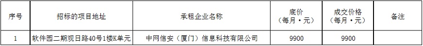 根據思明區(qū)國有企業(yè)資產出租管理的相關制度,我司2019年6月10日上午9:00起于觀音山營運中心2號樓2層2號會議室進行公開招租現(xiàn)場開標,現(xiàn)通過思明控股網站對外發(fā)布成交公告,內容如下:
