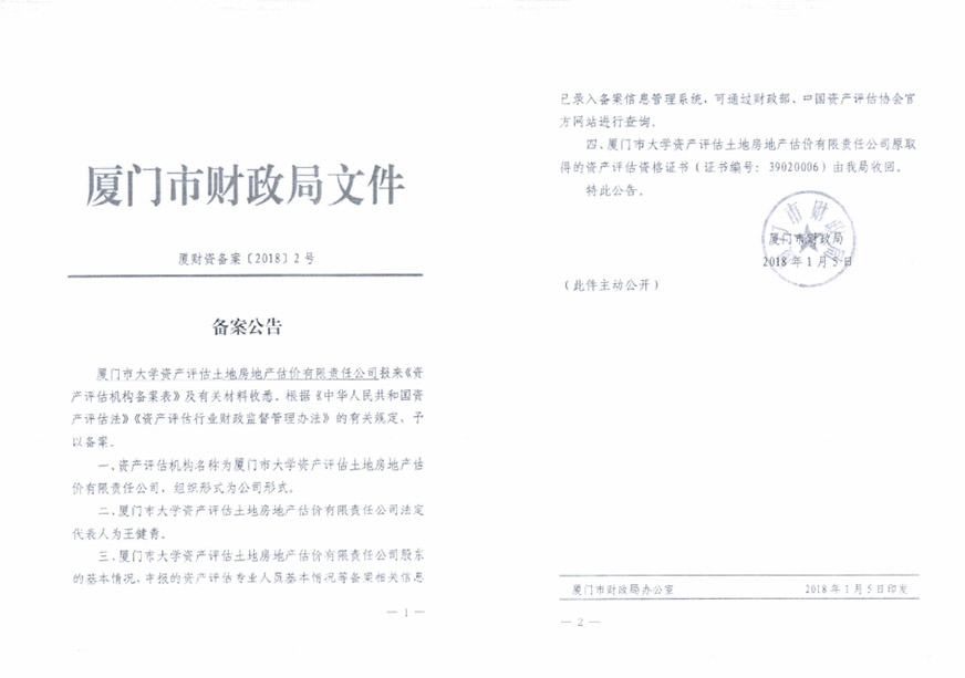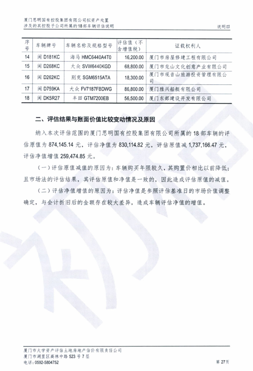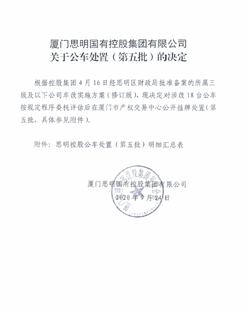 根據(jù)2020年6月5日我司報(bào)經(jīng)思明區(qū)財(cái)政局批準(zhǔn)備案的《關(guān)于報(bào)送所屬三級(jí)及以下公司車改實(shí)施方案事宜的情況說(shuō)明》相關(guān)文件精神,我司委托廈門市大學(xué)資產(chǎn)評(píng)估土地房地產(chǎn)估價(jià)有限責(zé)任公司對(duì)公車處置(第五批)的車輛進(jìn)行評(píng)估,該公司已于9月30日向我司提交資產(chǎn)評(píng)估結(jié)果初稿。現(xiàn)將評(píng)估結(jié)果進(jìn)行公示,如有異議,歡迎來(lái)電來(lái)函反映。