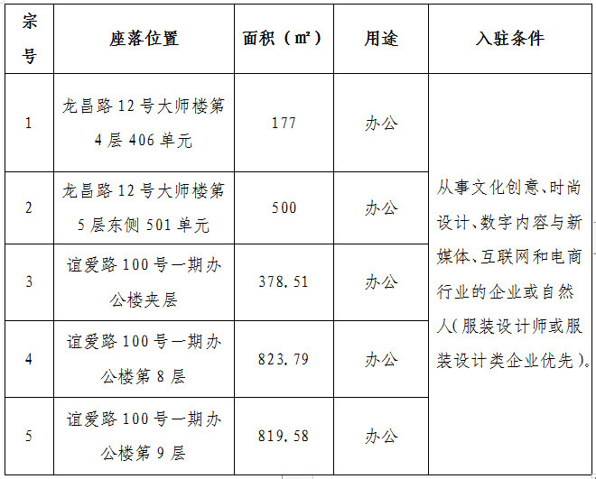 根據(jù)國(guó)有企業(yè)資產(chǎn)出租管理相關(guān)制度,我司決定對(duì)位于龍昌路12號(hào)、誼愛路100號(hào)嘉蓮商務(wù)中心下列5宗房產(chǎn)對(duì)符合入駐條件的意向承租人進(jìn)行公開競(jìng)價(jià)招租,具體信息如下: