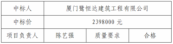 招標(biāo)項目編號為“(2021-ZWJ017曾厝垵4#樓玩月坡餐廳裝修工程”的招標(biāo),招標(biāo)人根據(jù)評標(biāo)委員會推薦的中標(biāo)候選人確定本項目中標(biāo)人,于2021年04月30日至2021年05月03日止進(jìn)行公示,中標(biāo)人的中標(biāo)情況公布如下: