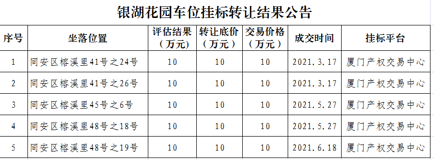 根據(jù)思明區(qū)國(guó)有企業(yè)資產(chǎn)管理的相關(guān)制度,我公司在廈門產(chǎn)權(quán)交易中心對(duì)銀湖花園5個(gè)車位(車位信息詳見下表)進(jìn)行公開資產(chǎn)掛牌轉(zhuǎn)讓。截止2021年6月25日,5個(gè)車位全部完成交易。現(xiàn)通過思明控股網(wǎng)站對(duì)外發(fā)布成交公告,內(nèi)容如下: