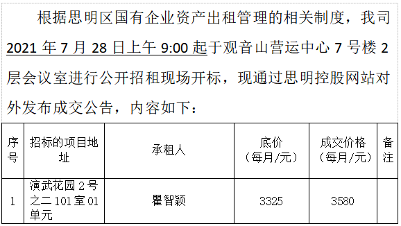 演武花園2號之二101室01單元房產(chǎn)招租成交公告