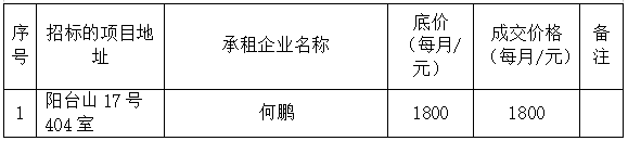根據(jù)思明區(qū)國有企業(yè)資產(chǎn)出租管理的相關(guān)制度,我司2021年8月9日上午9:00起于觀音山營運中心7號樓2層會議室進行公開招租現(xiàn)場開標,現(xiàn)通過思明控股網(wǎng)站對外發(fā)布成交公告,內(nèi)容如下: