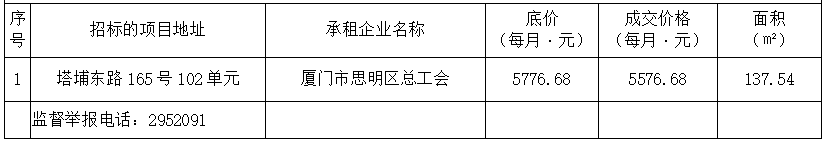 根據(jù)思明區(qū)國有企業(yè)資產(chǎn)出租管理的相關(guān)制度,我司2021年8月13日上午9:00起于觀音山營運中心7號樓2層會議室進行公開招租現(xiàn)場開標,現(xiàn)通過思明控股網(wǎng)站對外發(fā)布成交公告,內(nèi)容如下: