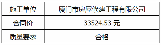根據(jù)招投標(biāo)管理辦法、思明控股辦[2021]14號(hào)文《采購招標(biāo)管理辦法》的相關(guān)規(guī)定,我廠負(fù)責(zé)故宮路95號(hào)室外雨水管拆除及新管安裝工程直接發(fā)包廈門市房屋修建工程有限公司實(shí)施,現(xiàn)通過思明控股網(wǎng)站于2021年12月 日至2021年12月 日進(jìn)行成交結(jié)果公示,內(nèi)容如下: