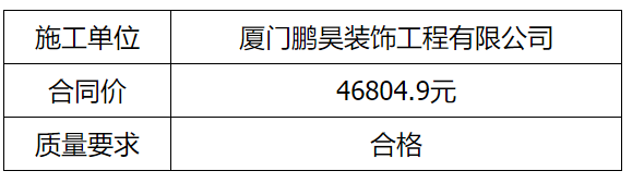 根據(jù)招投標(biāo)管理辦法、思明控股辦[2021]14號文《采購招標(biāo)管理辦法》的相關(guān)規(guī)定,我司負(fù)責(zé)龍山文創(chuàng)園工業(yè)設(shè)計中心LED拆除、墻面及自動玻璃門框補(bǔ)漆、花壇修補(bǔ)、雨水溝蓋更換上漆、圓形拱門沖洗等工程直接發(fā)包廈門鵬昊裝飾工程有限公司實施,現(xiàn)通過思明控股網(wǎng)站于2021年12月27日至2021年12月30日進(jìn)行成交結(jié)果公示,內(nèi)容如下: