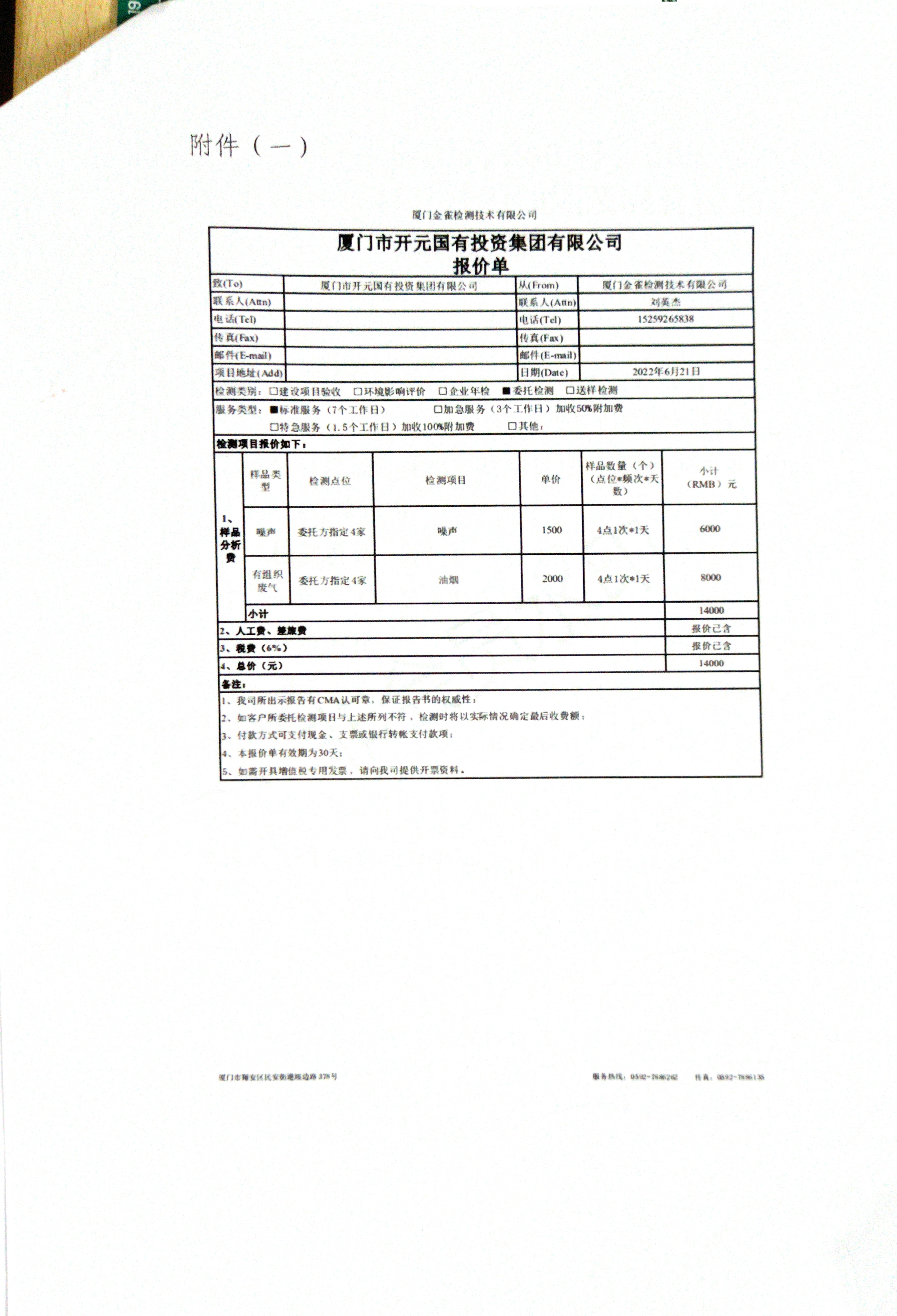 檢測費(fèi)用總價款為人民幣壹萬肆仟元整(¥:14000元),報價單詳見附件(一)。
