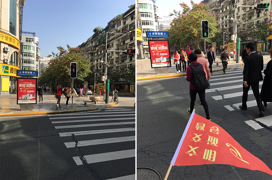 志愿者穿起紅色馬甲,佩帶紅帽子、口哨,手拿督導指示旗為城市文明助力